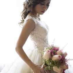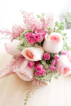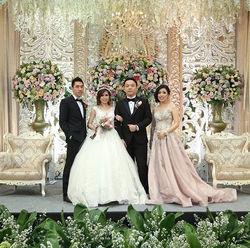 The wedding took place in JW Marriott Hotel, Jakarta. They asked for a classic round bouquet with soft colours to match the decoration of the venue. So we designed the bouquet with a little bit this and that. Using Ecuador Roses with premium quality fillers. And... Voila!