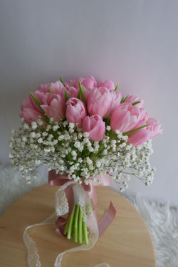 The wedding took place in Sampoerna Strategic Square, Jakarta. The bride asked for a simple classic bouquet of soft pink Tulip. So we designed the bouquet with a little bit this and that. And... Voila!