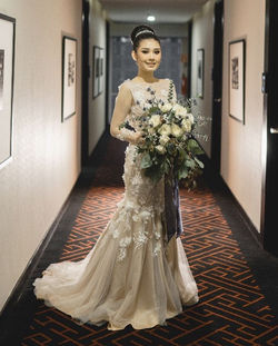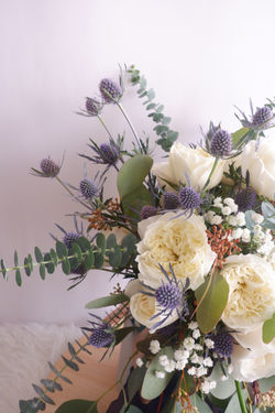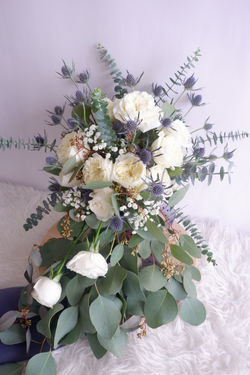 The wedding took place in Aston Priority Hotel Simatupang, Jakarta. The bride asked for a huge-rustic cascading bouquet with all white colors and a hint of navy blue to match the decoration of the venue. So we designed the bouquet with a little bit this and that. Using Garden Roses, Blue Eryngium, Eucalyptus and other premium quality fillers. And... Voila!
